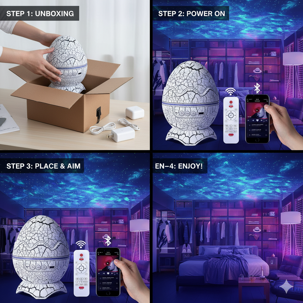 Dinosaur Egg Galaxy Star Projector — Romantic Ambient Night Lamp with Bluetooth Speaker & Nebula Lights